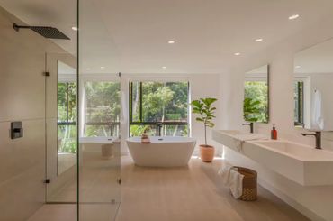 The suite features a luxurious oversized bathroom with both a walk-in shower and a freestanding soaking tub, offering a personal spa-like retreat at the end of each day. Soft natural light, modern finishes, and thoughtful touches create an atmosphere that feels grounding, elegant, and deeply restorative.