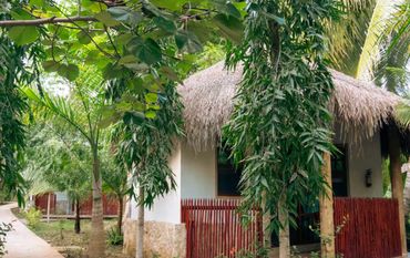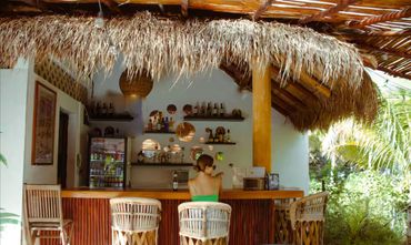 This space features a sumptuous King-sized bed adorned with plush linens and pillows, surrounded by jungle scenes. Get in touch with nature in your private ensuite bathroom with elegant finishes under the open sky. Each bungalow has its own kitchenette and patio for your morning rituals. A/C included in all bungalows.