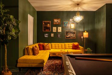 Private speakeasy game room with pool table, poker table, foosball, arcade, and lounge seating with a curated gallery wall— a one-of-a-kind desert retreat experience.